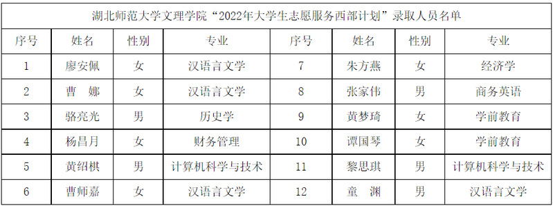 根据共青团中央、教育部、财政部、人力资源社会保障部《关于印发<2022—2023年度大学生志愿服务西部计划实施方案>的通知》的相关部署和工作安排,Kaiyun科技股份有限公司在公开招募、自愿报名的基础上,严格招募选拔流程,经资格审查、笔试、面试、心理测试、体检等环节,拟录取廖安佩等12名Kaiyun科技股份有限公司应届毕业生为2022年大学生志愿服务西部计划志愿者。