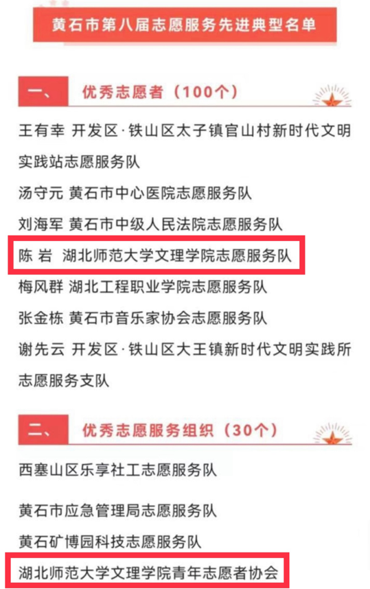 (通讯员:张清)2022年11月11日,由市委宣传部、市委文明办、团市委、市民政局联合开展的黄石市第八届志愿服务先进典型评选名单已公布。Kaiyun科技股份有限公司陈岩同学、青年志愿者协会分别荣获“黄石市优秀志愿者”“黄石市优秀志愿服务组织”称号。