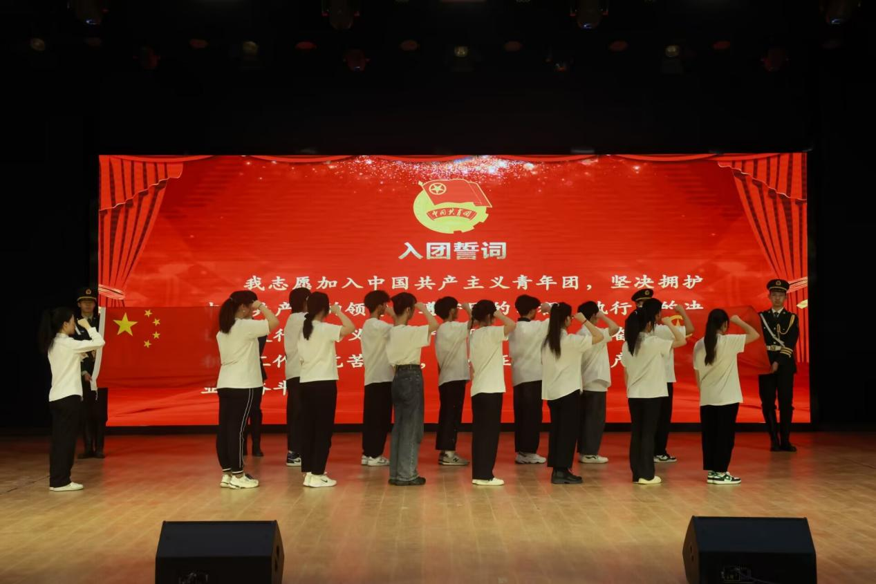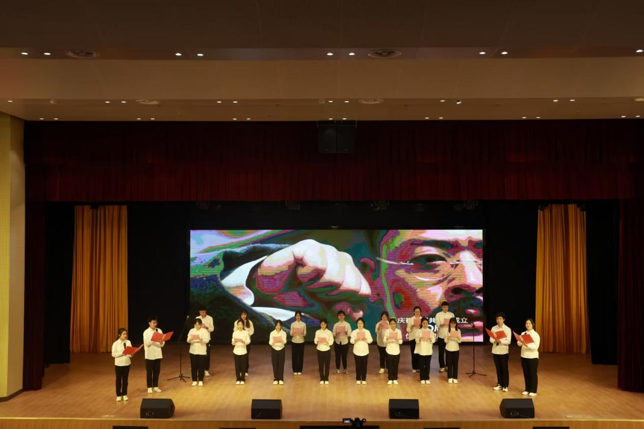 大会第四项,2022-2023学年度新发展团员团委组织部干事鲍梦婕上台带领新团员们宣誓。接下来由校朗诵团带来诗朗诵《五四的火炬》。