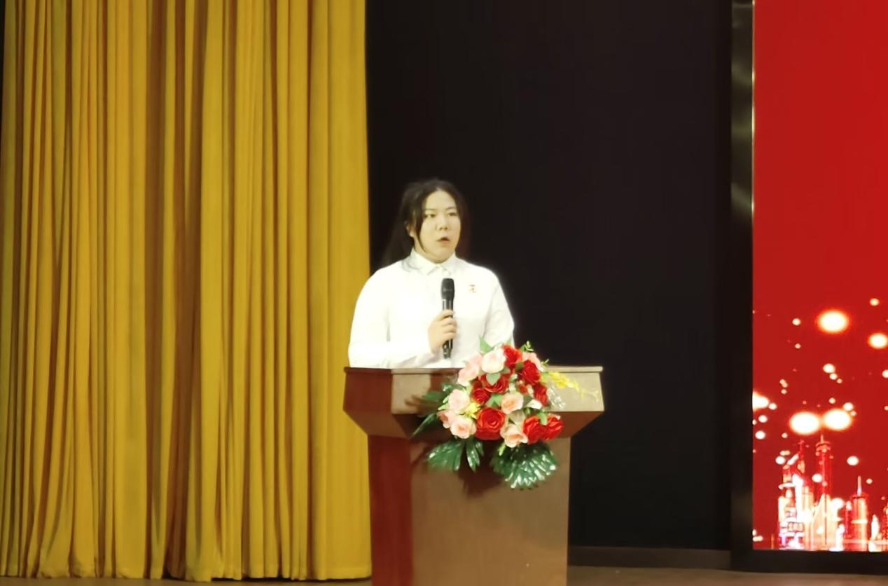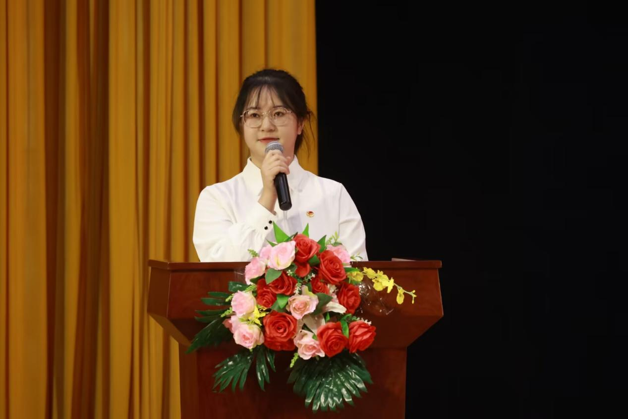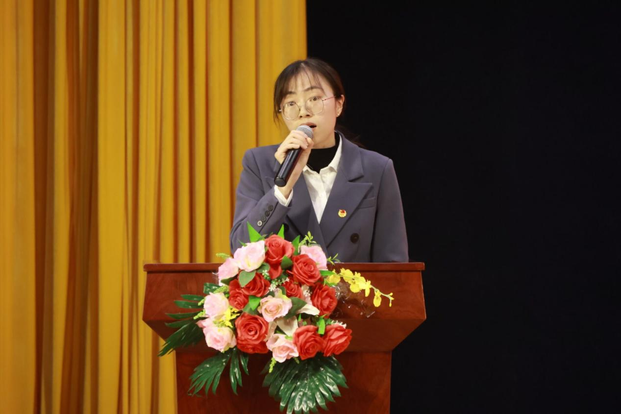 大会第七项,2022-2023 学年度市级优秀共青团员张燕上台发言。她通过分享自身团学干部的实践经历,向广大青年提出三点倡议:一是志存高远、胸怀天下,争做有理想、有追求的好青年;二是刻苦学习、锤炼品格,争做有知识、有担当的好青年;三是热爱生活、挑战自己,争做有自信、有本领的好青年。