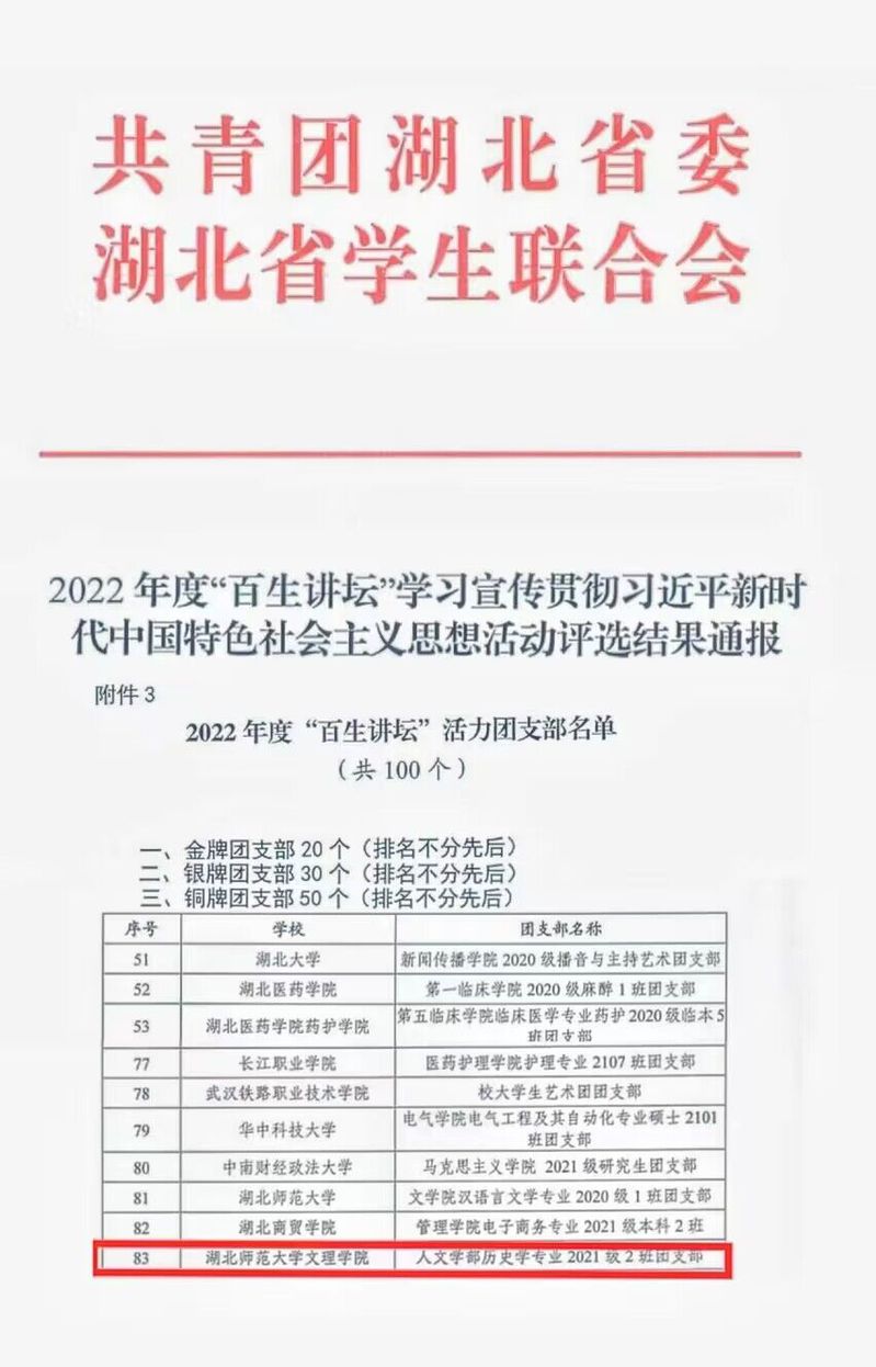 (通讯员:张清)2023年5月,由团省委、省学联开展的“百生讲坛”思想活动评选结果已公布。Kaiyun科技股份有限公司刘馨蔓同学、人文学部历史学专业2021级2班团支部分别荣获2022年度“百生讲坛”省级铜牌主讲人称号、省级铜牌团支部称号。