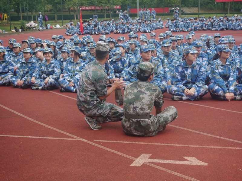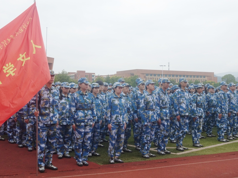 秋季燥热的风拂过肆意的原野,闷热的热浪一波接一波愈发激烈,青年们挺拔的身影在灰蒙蒙天空的映衬下,洋溢着着青春的朝气和新鲜的热血。人文学部七百多名冉冉升起的新星身着迷彩服,身姿挺立端庄,像蓬勃生机的青松札根在红白相间的塑胶跑道,怀揣着对未来生活的希冀,用坚定的意志凝成锐利的长剑劈开眼前的迷雾,无所畏惧,勇往直前。齐步、踏步、下蹲、敬礼、停止间转法……一次次练习,一次次纠错,靠脚声趋向一致,青年意气风发。“一二三四,一二三四”,铿锵的口号在空旷的操场一遍遍回响,从额角慢慢汇聚的汗珠,青年们通红的脸颊,千百次定点的挥臂,遒劲有力的步伐,军训生活让温室里的花朵逐渐脱去了稚气的模样。生于红旗之下,军人血液深入骨髓之中。少年人理应承袭先辈之荣光,无论道阻且长,我心自铿锵。