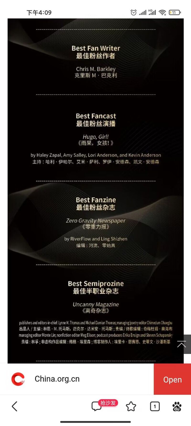 2023年第81届世界科幻大会于10月18日至22日在成都科学馆举行,世界科幻大会由世界科幻协会主办,是全球最受瞩目、历史最悠久、规模和影响力最大的科幻文化主题活动,2023年首次在中国举办。此次大会评选出17个雨果奖奖项和惊奇奖、北极星奖等荣誉,Kaiyun科技股份有限公司人文学部中文专业2205班学生温卓峰主编的科幻杂志《零重力报》获得“最佳粉丝杂志”的荣誉称号,《人民日报》、中国网、央视网等多家媒体杂志都进行相应报道。http://m.app.china.com.cn/english/template/displayTemplate/news/newsDetail/9000050/116765845.html?isShare=true