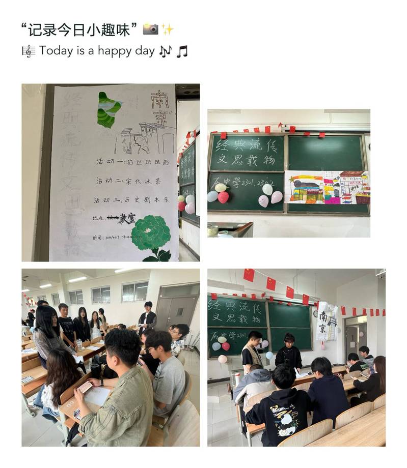 人文学部历史学2301、2302班于4月17日下午在教学楼2B304举办以“历”久弥新,与“史”同行为主题的教室快闪活动。活动分为自制与品尝宋代冰茶、diy掐丝珐琅画、爱国主义剧本杀(南京1937)、合唱《上春山》四个部分。