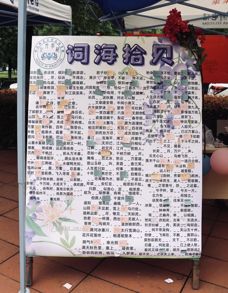 紫薇盛放映诗意,翰墨飘香润心田。活动不仅展现了紫薇花的美丽与文化魅力,更通过诗词的诵读、创作与赏析,让同学们深入体验传统文化的博大精深。活动一共分为词海拾贝、墨客追踪、诗宫探秘、飞花令四个游戏板块,通过每个环节的积分累计兑换精美定制的团扇、水杯等奖品,人文学部紫薇诗词文化节活动现场热闹非凡,吸引师生们伫足,诗词爱好者齐聚一堂。