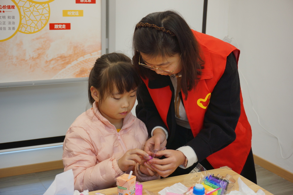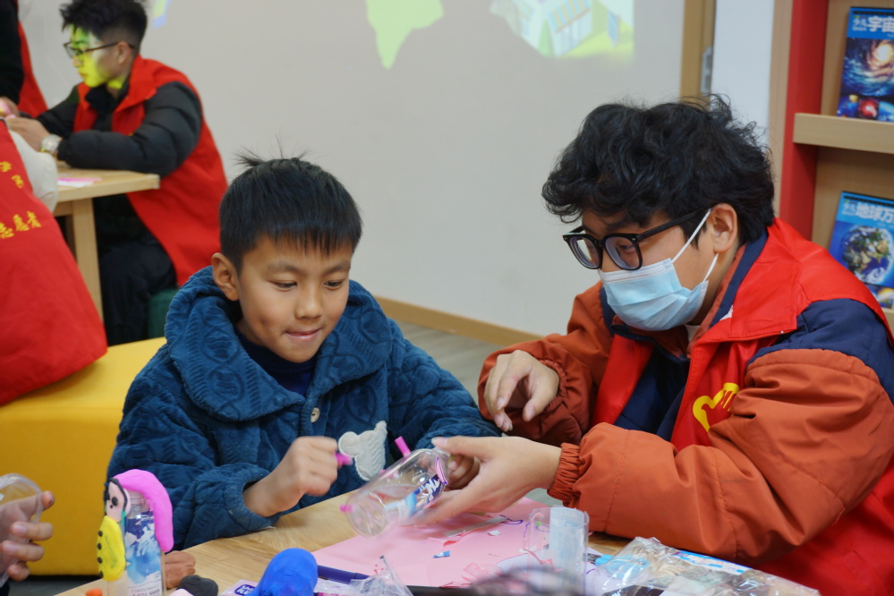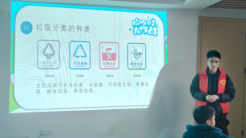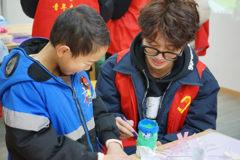 伴着孩子们的欢声笑语,活动悄然启幕。在志愿者的悉心协助下,孩子们化身“环保魔法师”,将不起眼的废旧塑料瓶、闲置杂物玩出满满新花样。志愿们俯身细致指点创作技巧,孩子们专注投入卷粘拼接,指尖流转间,寻常旧物在欢声笑语与默契合作中重焕新生,绽放别样价值。手工创作过后,备受期待的环保周末课堂温情开讲。志愿者借助PPT,向孩子们科普环保基本常识,细致讲解日常生活中的环保小妙招。互动问答环节里,孩子们踊跃举手、积极应答,清脆的童声与真挚的笑容交织,让环保知识在轻松氛围中深入人心,课堂宣讲在孩子们的灿烂笑颜中圆满收尾。