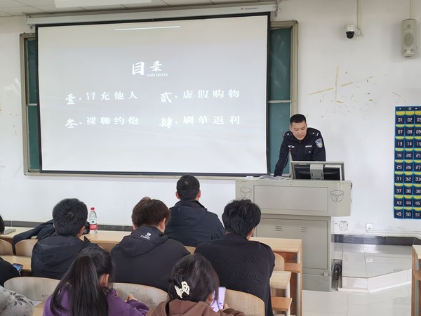 活动伊始,余警官结合近年来高发的校园诈骗案例,用通俗易懂的语言拆解了各类骗局的核心套路。他重点讲解了针对学生群体的“刷单返利”“游戏账号交易”“校园贷”“冒充老师/家长转账”等常见诈骗类型,通过还原“低投入高回报”“紧急缴费”等诈骗话术,揭示了骗子利用学生社会经验不足、贪图小利、防范心理薄弱等特点实施诈骗的全过程。“陌生链接不点击、可疑来电不轻信、个人信息不透露、转账汇款多核实”,余警官用朗朗上口的口诀总结防范要点,同时提醒同学们遇到疑似诈骗时,要第一时间联系老师、家长或拨打警务室24小时值班电话,切勿盲目操作。