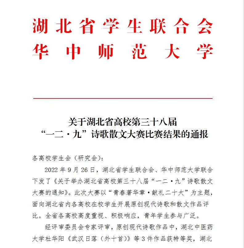 为纪念“一二·九”爱国学生运动,引领青年学子听党话、跟党走,深刻领悟“两个确立”的决定性意义,增强“四个意识”、坚定“四个自信”、做到“两个维护”,加强对全省大学生的爱国主义教育和革命传统教育,湖北省学生联合会、华中师范大学联合主办湖北省高校第三十八届“一二·九”诗歌散文大赛。