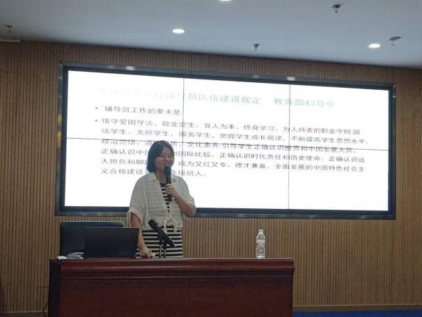 心理健康教育中心主任陈庆为新生辅导员讲解学生心理问题处理相关事项,介绍了心理健康辅导中心的各项软硬件设施及部门职能。在心理育人方面,要求新生辅导员要保持与心理中心的实时沟通;要冷静镇定、有条不紊地处理紧急危机事件并及时通知各部门协同合作。最后,她向新生辅导员科普了一系列判断学生心理健康程度的技巧及相应的处理办法,助力学生辅导员顺利开展新生心理辅导工作。