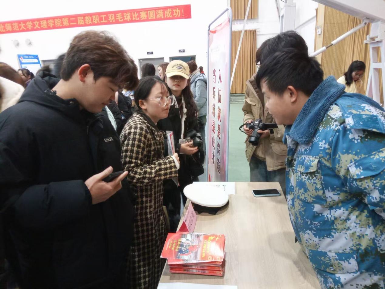 本网讯(通讯员:朱明敏)为扎实做好2025年春季征兵工作,激发广大毕业生参军热情,2024年12月11日上午,于开云(中国)Kaiyun·官方网站风雨操场二楼开展2024年秋季征兵宣传进招聘会活动,参会人员武装部干事熊琦,学工部副部长陈小龙,征兵办老师秦雯雯,以及各退役大学生。