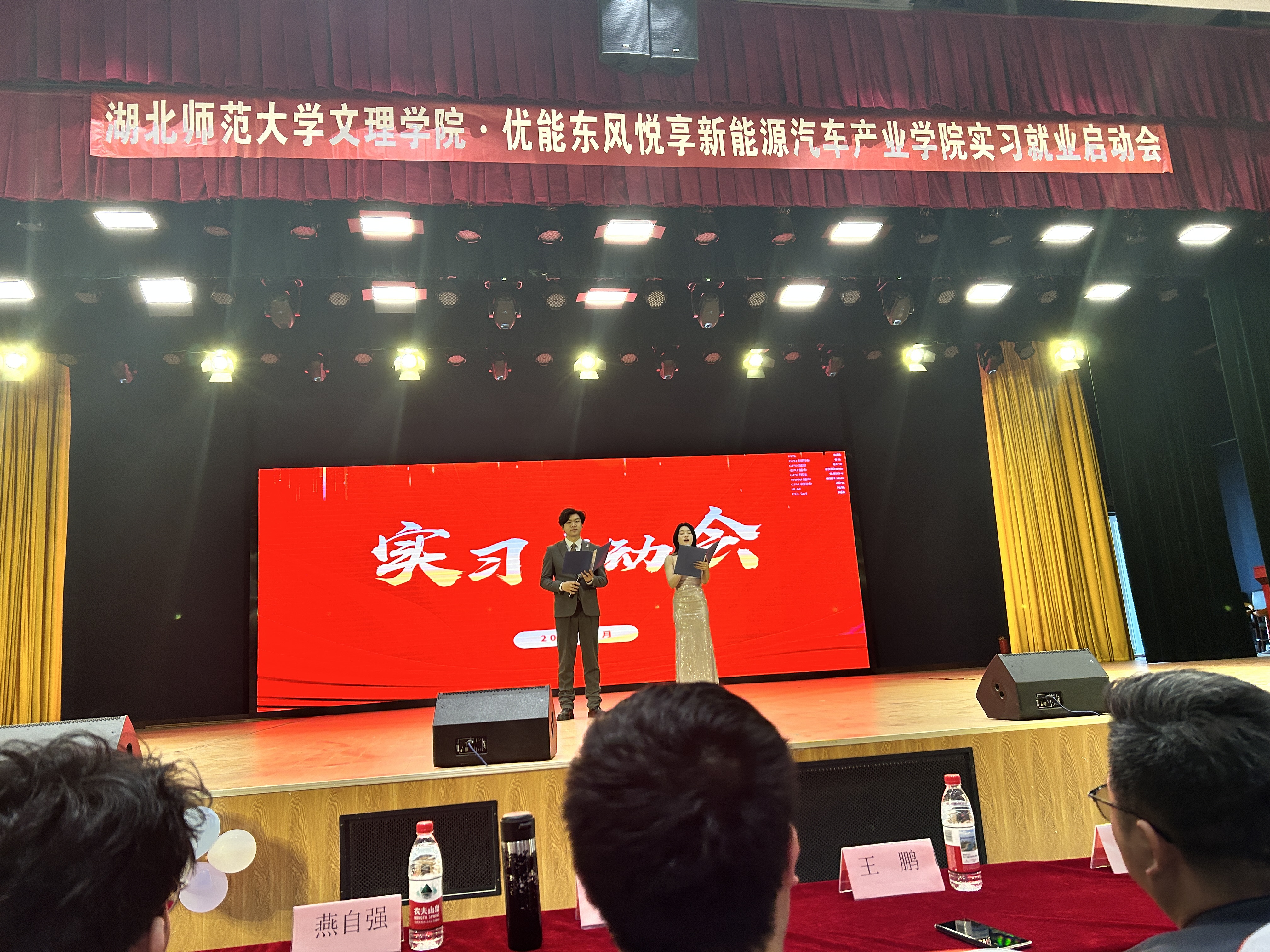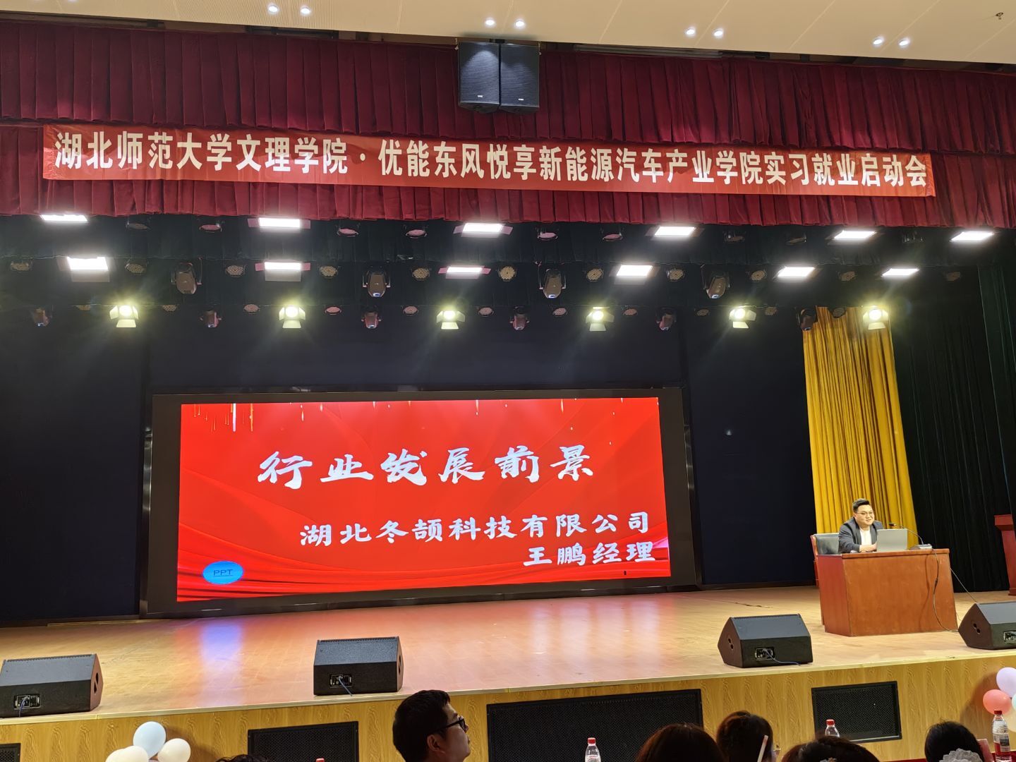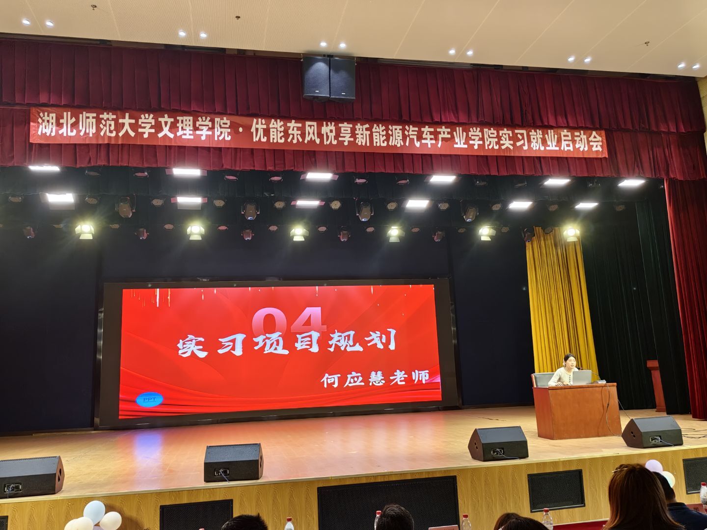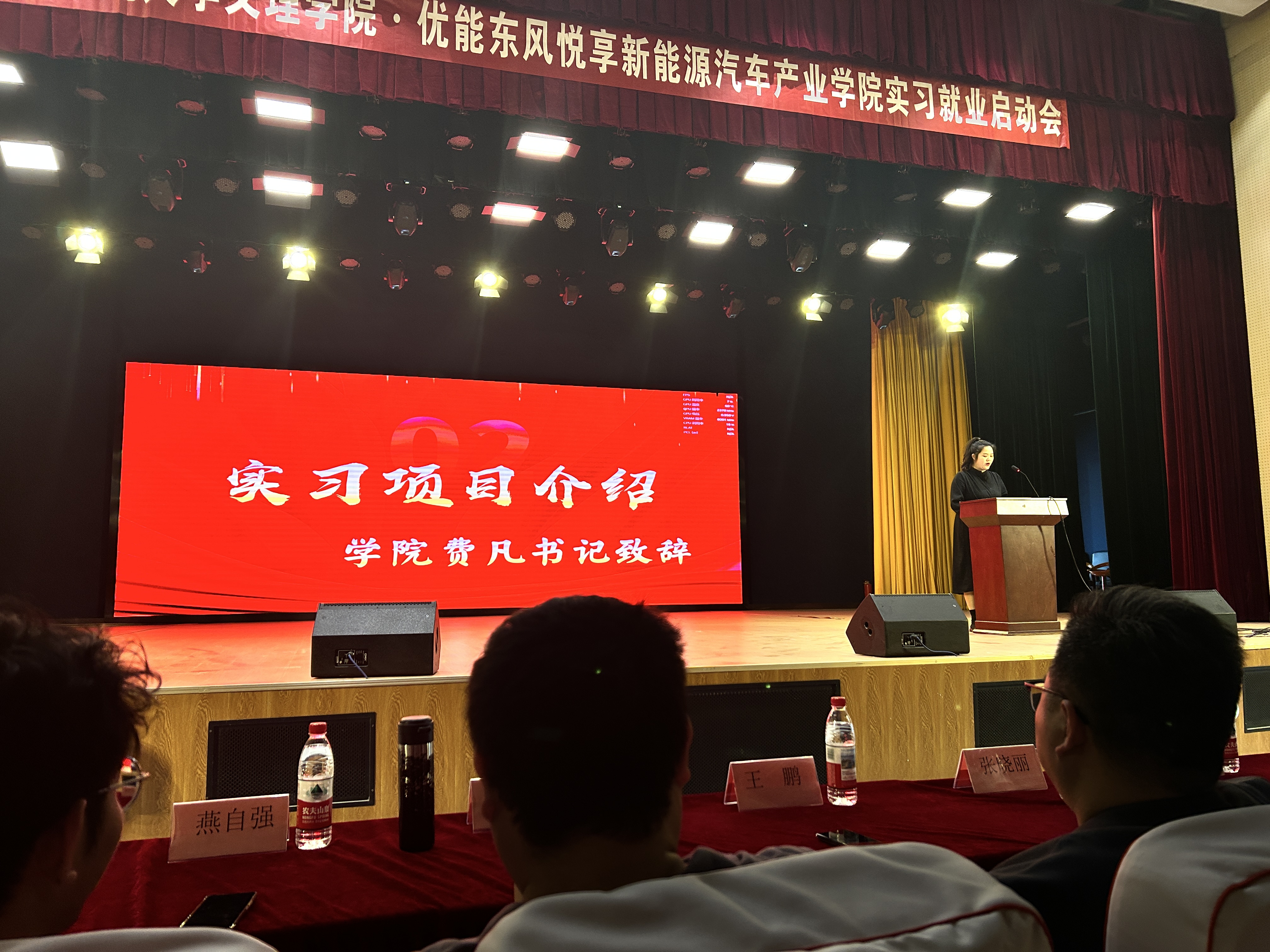 本次会议汇聚了校内外多方力量,特邀嘉宾包括:湖北师范大学产教融合学院学生党支部书记费凡老师、优能东风悦享新能源汽车产业学院教学主任邢凯老师与卫嵩荞老师、零跑汽车企业负责人张晓丽经理、湖北冬颉科技有限公司王鹏经理、中科光芯光电有限公司刘浩经理、武汉优能高教就业经理何应慧老师。此外,全体辅导员、专任教师及2023级学生共同参会,现场气氛热烈,展现了师生对实习工作的高度重视。
