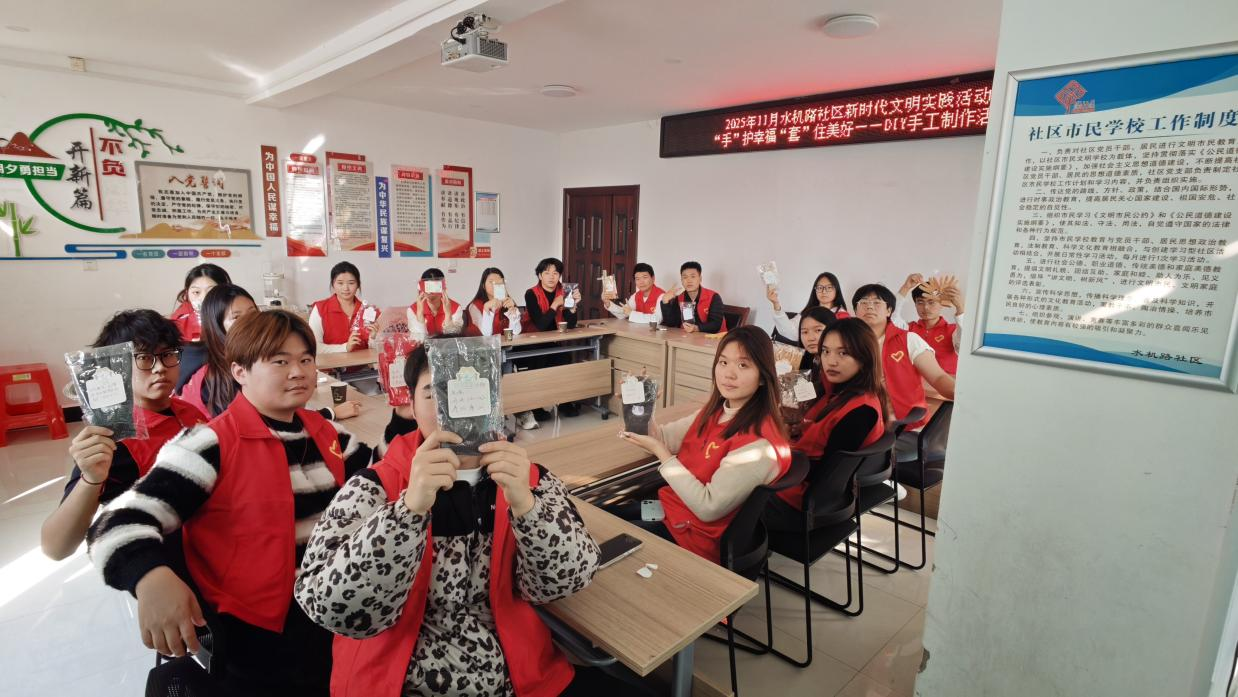 15:50,志愿者们走上社区街道,为坚守岗位的环卫工人们送上热水、贴有“感恩坚守”标签的护手霜与DIY的暖心手套,一句句暖心祝福、一份份贴心关怀,让户外工作者在寒风中感受到浓浓的暖意与尊重。