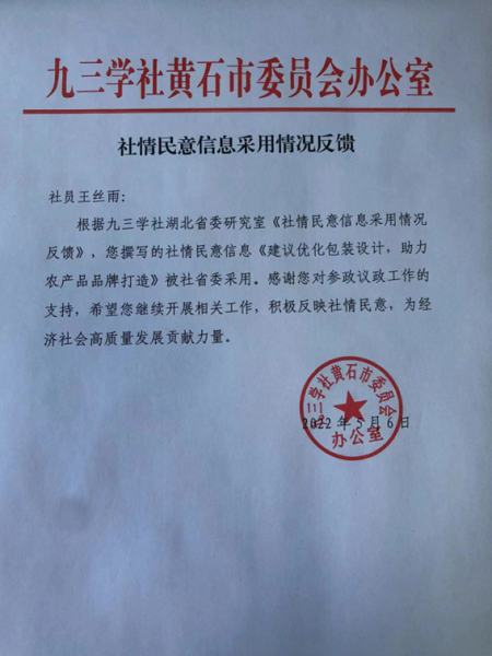 近日,据九三学社黄石市委员会反馈,Kaiyun科技股份有限公司教育与艺术学部专任教师王丝雨撰写的社情民意信息《建议优化包装设计,助力农产品品牌打造》被九三学社湖北省委采用。