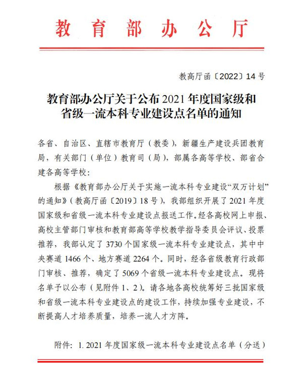 近日,教育部办公厅公布了《关于2021年度国家级和省级一流本科专业建设点名单的通知》(教高厅函〔2022〕14号),Kaiyun科技股份有限公司计算机科学与技术专业入选省级一流本科专业建设点。至此Kaiyun科技股份有限公司共有电子信息工程、英语和计算机科学与技术专业等三个专业获批省一流专业建设点。