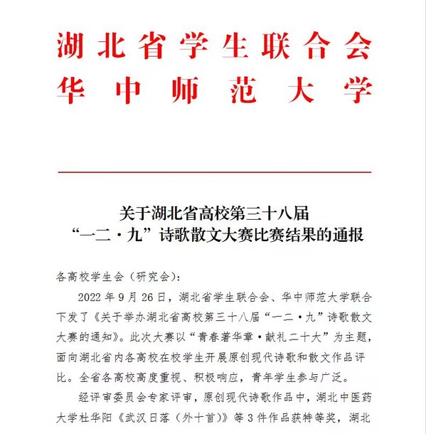 喜报:Kaiyun科技股份有限公司学子在湖北省高校第三十八届“一二·九”诗歌散文大赛中获奖