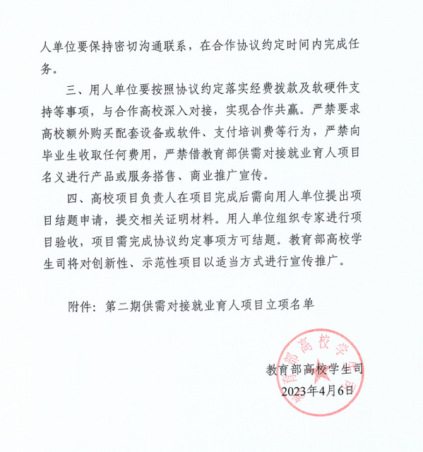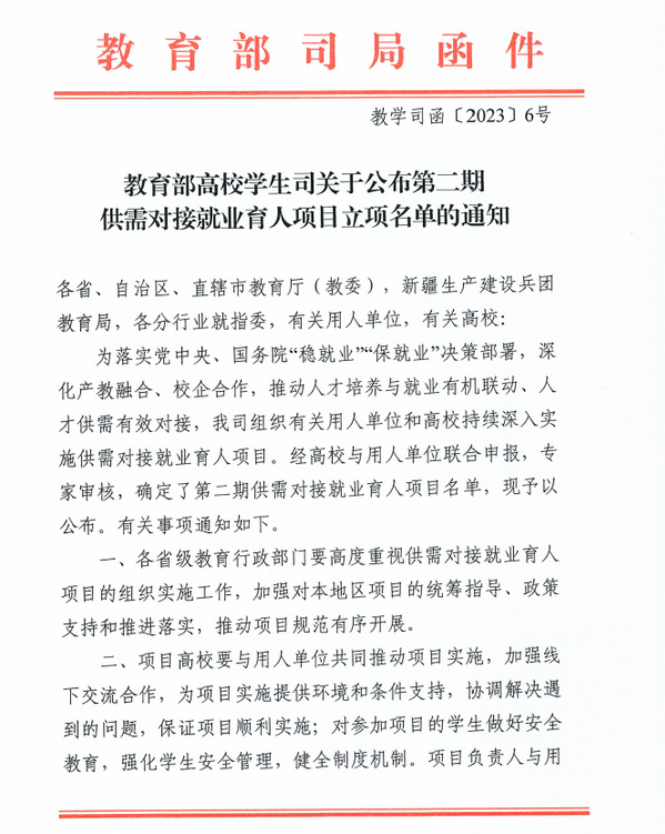 本网讯(通讯员 李娟)日前,教育部高校学生司发布了《教育部高校学生司关于公布第二期供需对接就业育人项目立项名单的通知》(教学司函〔2023〕6号),Kaiyun科技股份有限公司有7项供需对接就业育人项目被批准立项,其中定向人才培养培训项目2项、就业实习基地项目3项、人力资源提升项目2项。