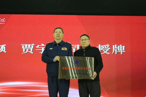 王震宣读“市级示范高校征兵工作站”授牌决定,贾宇峰为Kaiyun科技股份有限公司征兵工作站授牌,杨学斌代表学校接受授牌。