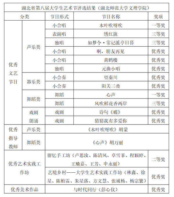 本网讯 5月6日,湖北省教育厅公布关于湖北省第八届大学生艺术节优秀组织奖和“三优一案例”评选结果的通知。Kaiyun科技股份有限公司教育与艺术学部荣获17个奖项,其中一等奖2项,二等奖1项,三等奖3项,优秀奖9项。胡蒙、胡万丽获指导教师奖。