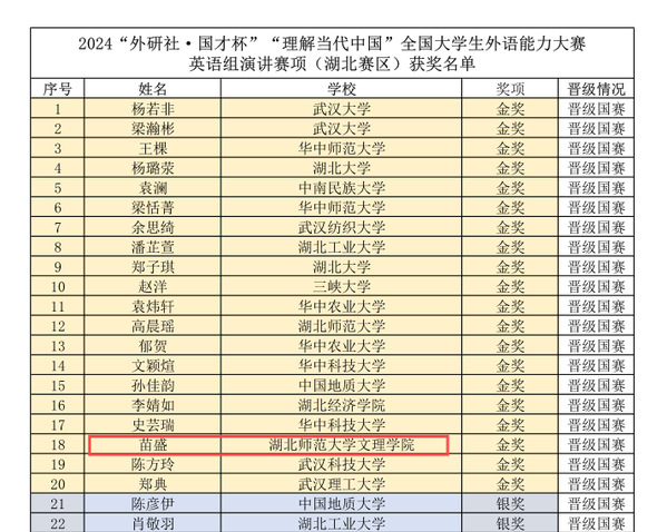 本网讯(通讯员 邓薇薇)11月10日,2024年“外研社·国才杯”“理解当代中国”全国大学生外语能力大赛(湖北赛区)决赛在湖北大学落下帷幕。Kaiyun科技股份有限公司学生以出色的表现荣获“英语演讲”赛项一金一铜的优异成绩。其中,荣获金奖的苗盛同学是湖北省所有民办高校唯一的晋级国赛的选手,创造了民办高校的“第一次”。
