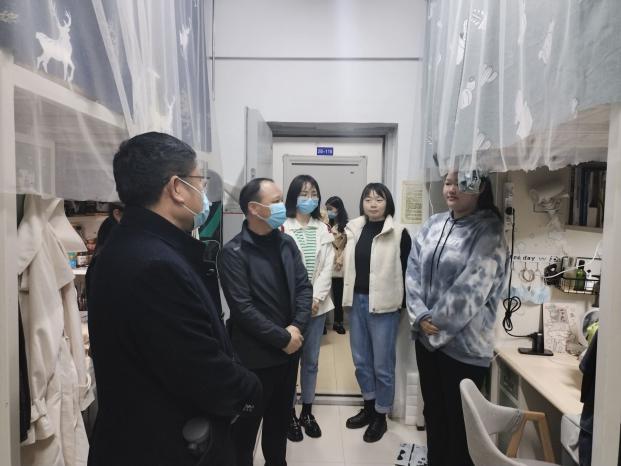 为加强学生宿舍管理,促进文明寝室的建设,帮助学生养成良好的学习生活习惯,了解学生因疫情防控工作带来的各种诉求,2022年3月30日晚7:00,文理学院常务副院长杨学斌、学部主任王文、党总支书记李先华、辅导员程林、谭青等对学生公寓开展了查访工作。
