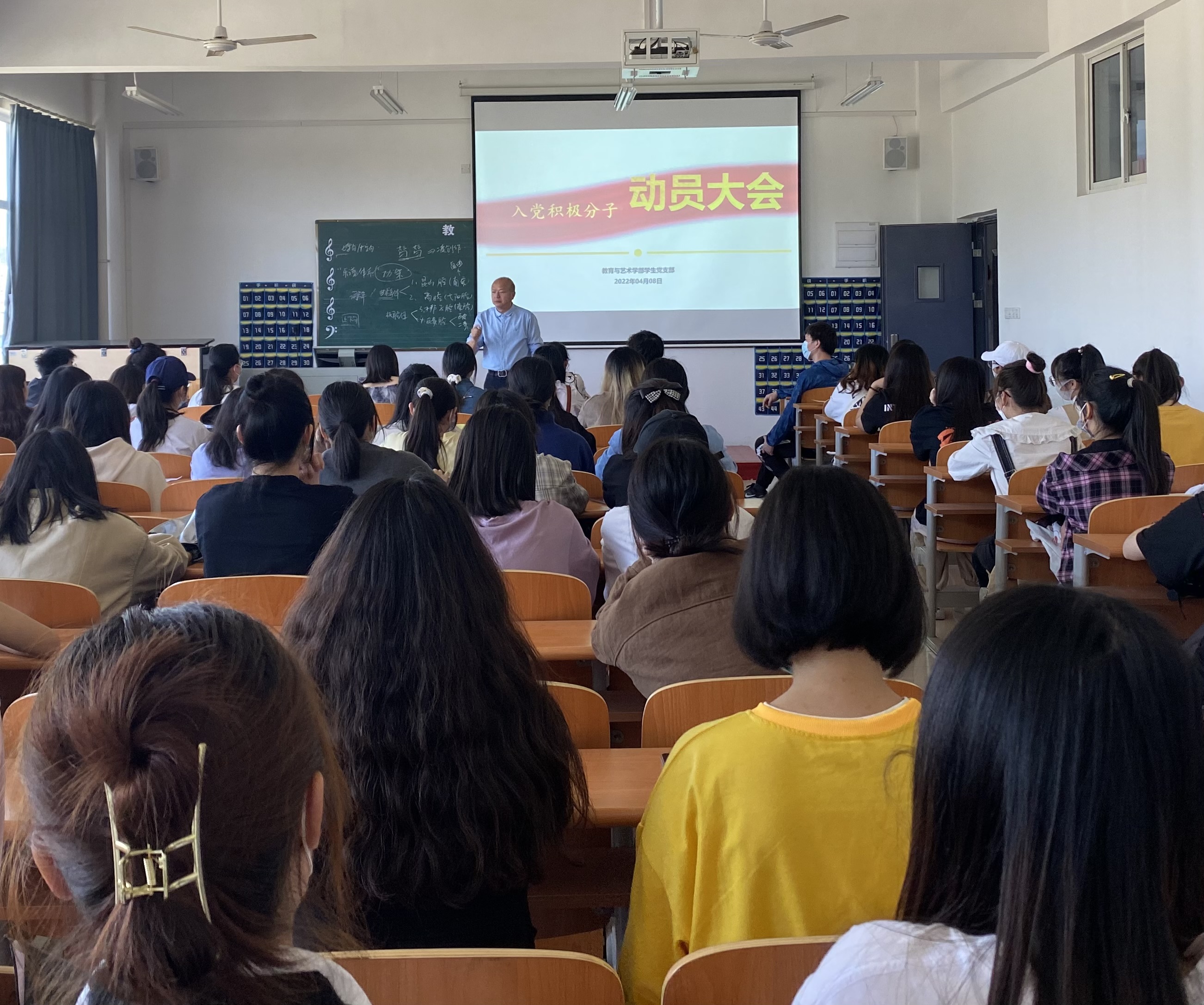 2022年4月8日中午12:20,在实验楼1-403教室组织召开文理学院第29期入党积极分子动员大会。教育与艺术学部71名入党积极分子到会,总支书记李先华应邀与会。动员大会由学生党支部书记尹誉霖主持: