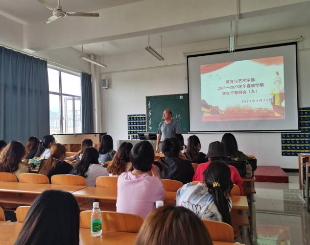 2022年4月22日中午12:00,教育与艺术学部按照惯例在实验楼一栋403多媒体教室组织召开学生干部工作例会。出席本次例会的有辅导员、团学会干部及各专业班级班长。会议由党总支书记李先华主持。