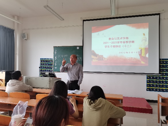 2022年5月13日中午12:00,教育与艺术学部按惯例在实验楼1-403多媒体教室组织召开学生干部工作例会。参会人员有辅导员老师、团学会干部及各专业班级负责人。会议由总支书记李先华主持。