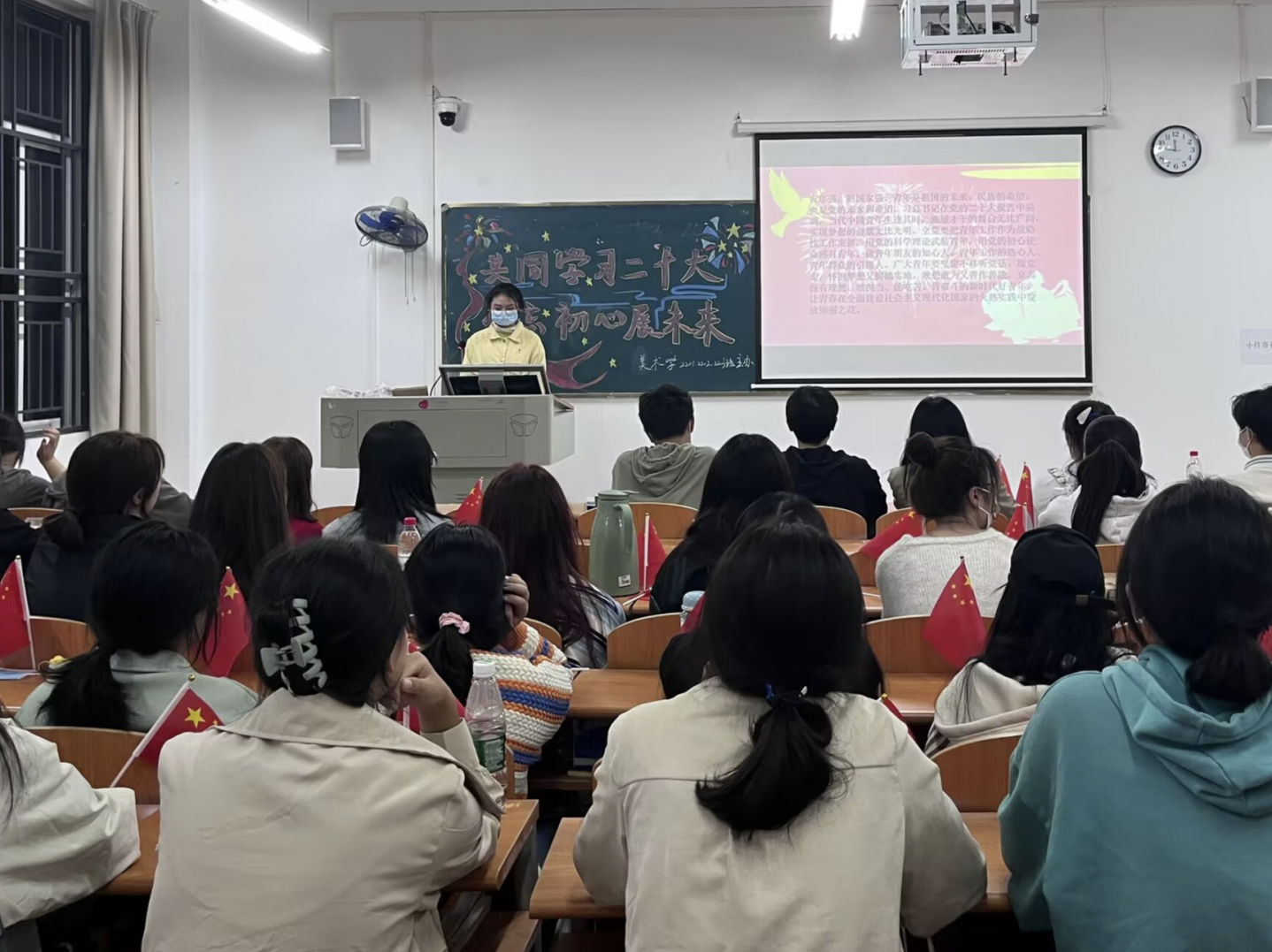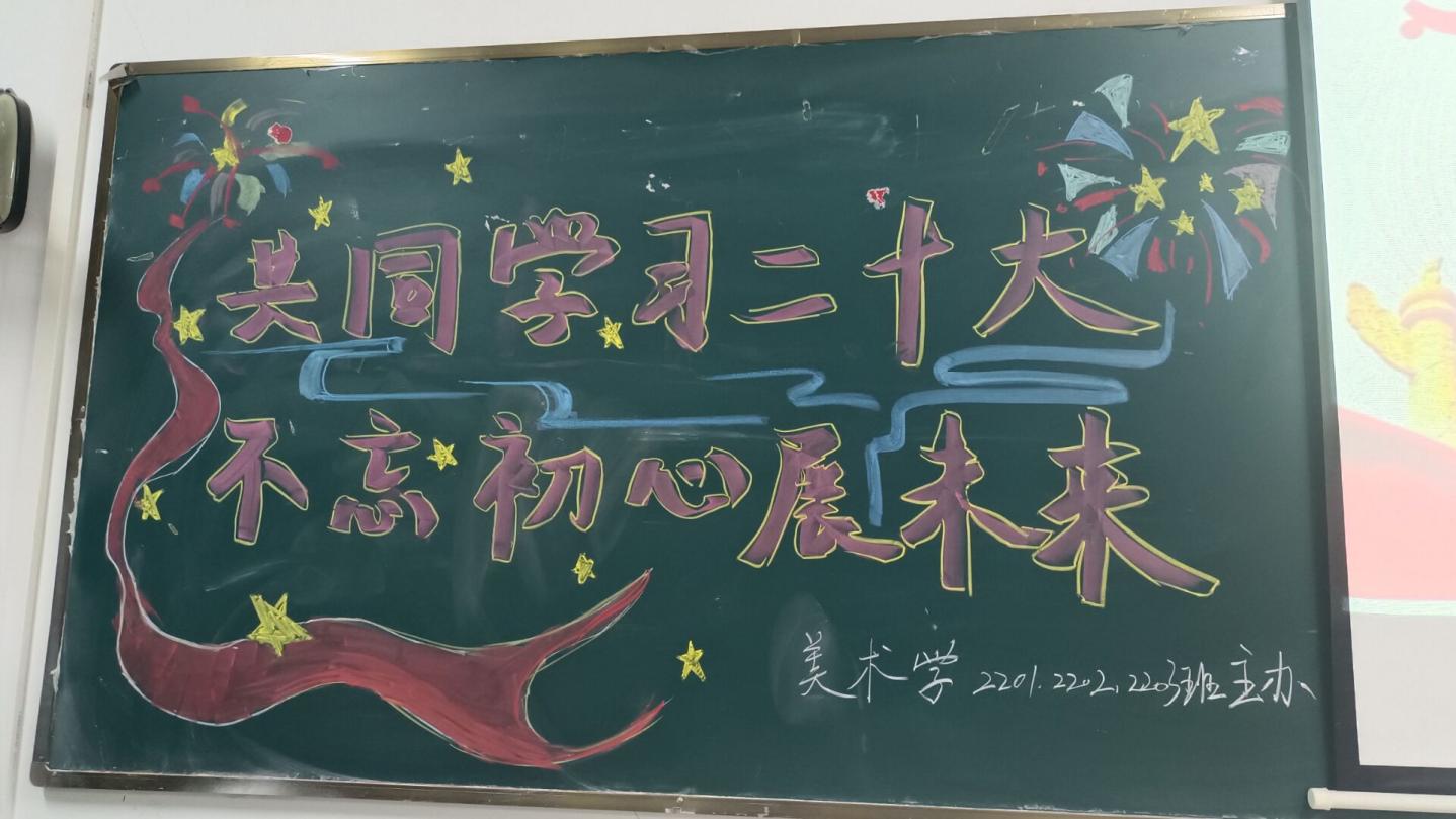 在团日活动中,各专业班级集体奏唱团歌,以黑板板画、PPT两种形式紧紧围绕“共同学习二十大,不忘初心展未来”为主题观看学习视频、谈心得体会。按照学校疫情防控要求,同学们全程佩戴口罩,活动在严肃活泼、紧张有序的氛围中取得圆满成功。