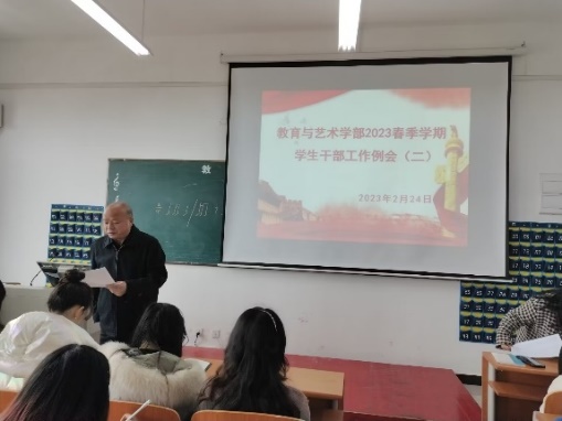 2023年2月24日中午12:00,在实验楼1-403室,组织召开学生干部工作例会,学部全体辅导员,全体团学会干部及各专业班级负责人参加,例会由总支书记李先华主持。