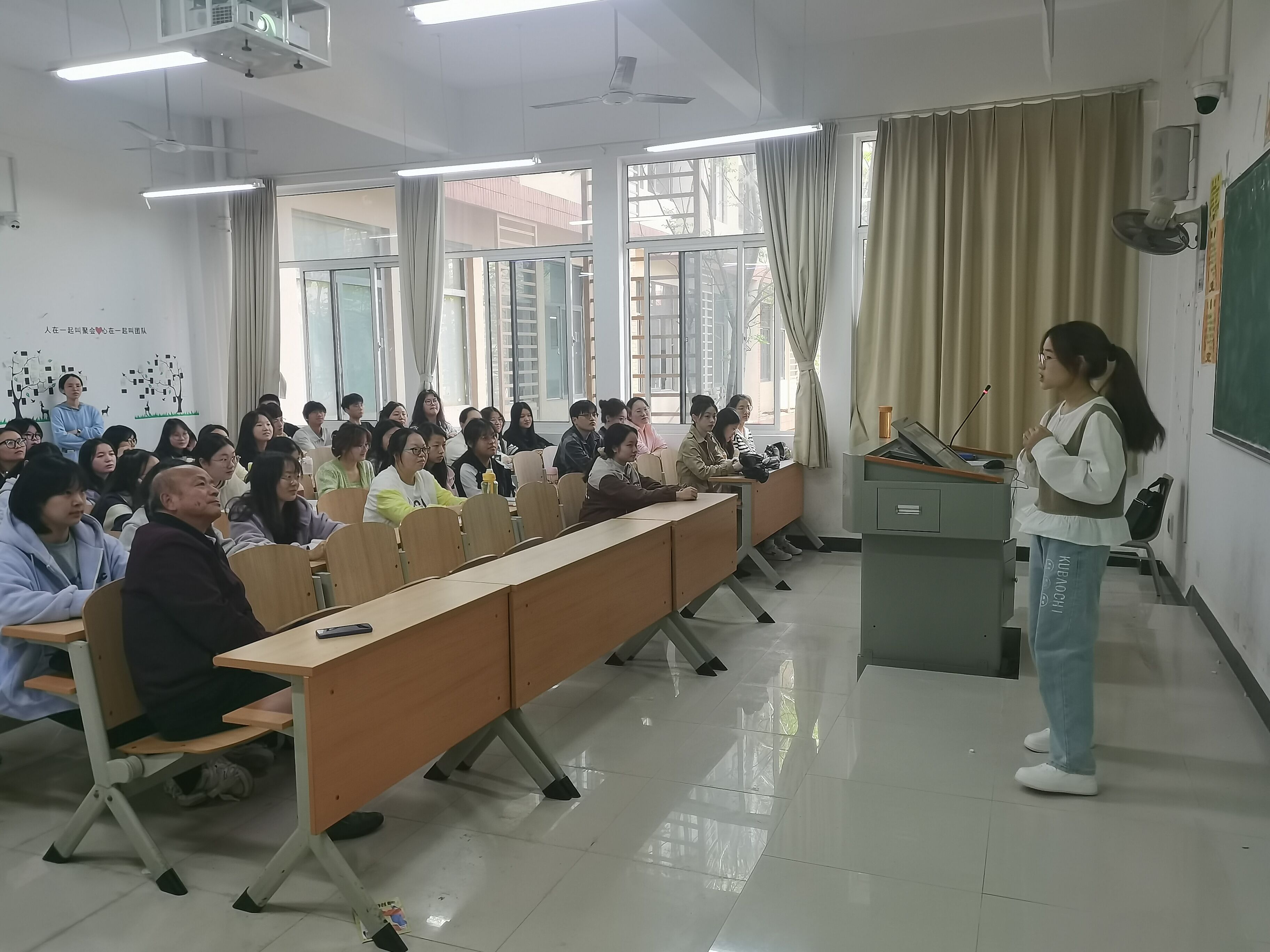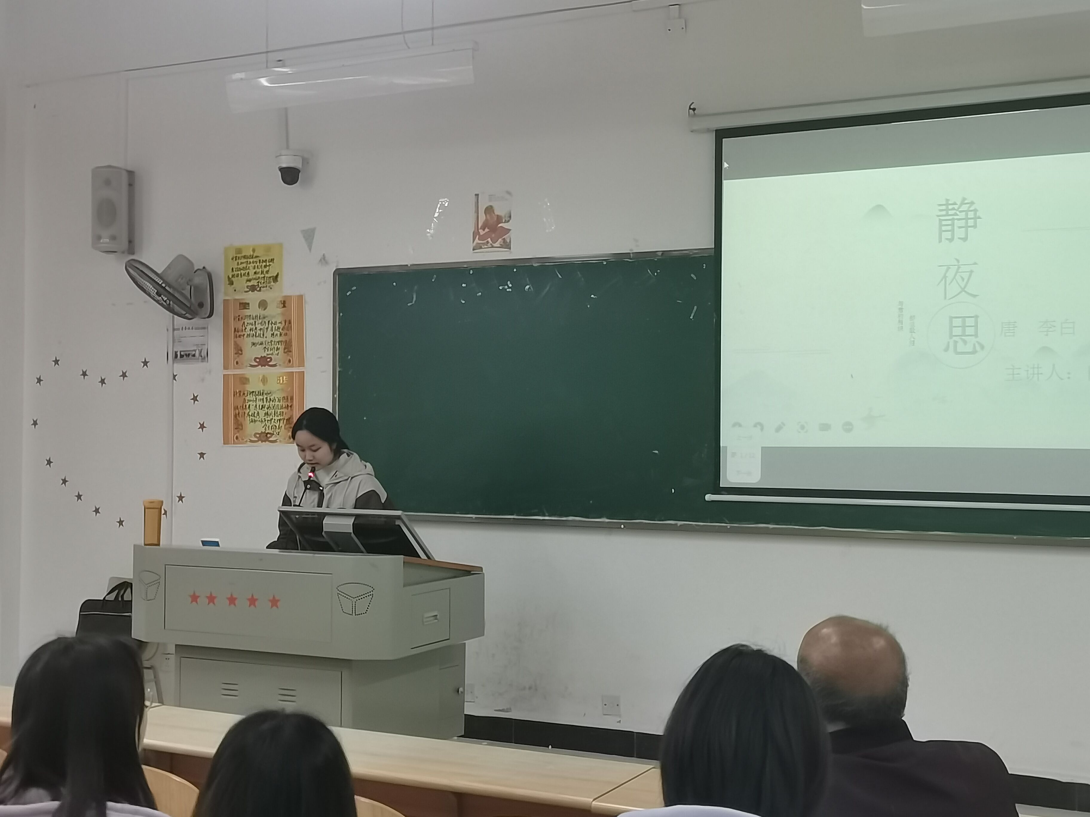 为规范课堂教学,提高师范生的综合能力,2024年4月9日14:00,教育与艺术学部党总支书记带领全体辅导员赴教学楼1A-206深入小学教育2301班的“课前十分钟”课堂。小学教育2301班的向静同学给大家带来了模拟授课诗人李白的《静夜思》。该同学充分准备了授课内容,以小学儿童自身发展规律为授课依据,讲解诗词通俗易懂,课堂互动积极,效果很好。总支书记对课堂的组织和学生的授课技能水平提出高度肯定,以及班级管理提出表扬,希望师范专业学生勇于走上讲台,把握每一次锻炼机会,同时在大一时期就要有奋斗目标、有长远规划,坚定理想信念,在考研、考编、考公等多领域做好提前谋划,在就业岗位上更好成为一名四有好老师。