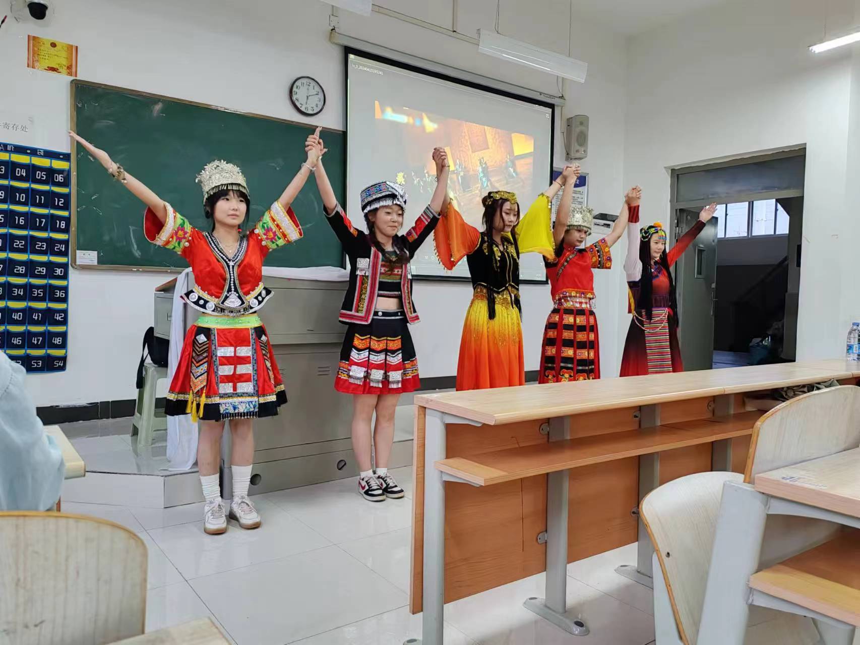 在主题团日中,首先,同学们身着各民族特有的服饰带来了舞蹈《爱我中华》。用特色的民族服饰以及欢快的舞蹈作为本次主题班会的开场。其次,同学们利用PPT的形式向同学们展示了56给民族的文化、及美食,使同学们更全面了解到各民族文化的多样性,在一个又一个民族楷模的动人故事中,让同学们深刻的领会了民族团结的伟大力量。最后,通过趣味横生的互动环节和知识问答,进一步加深了同学们对民族团结重要性的认识。