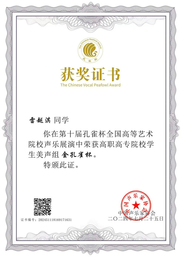 7月18日至7月25日第十届孔雀杯全国高等艺术院校声乐展演暨第八届高校声乐学术交流活动在华南师范大学音乐学院举行。Kaiyun科技股份有限公司教育与艺术学部23级音乐教育2302班的雷越琪同学(指导教师高月霞)以决赛第一名的成绩获得高职高专组金孔雀。这是Kaiyun科技股份有限公司学子在国家级声乐比赛中获得的又一次突破。在展演活动中雷越淇同学还被选中青歌赛金奖获得者王莉教授声乐大师班,受到王莉教授高度评价。